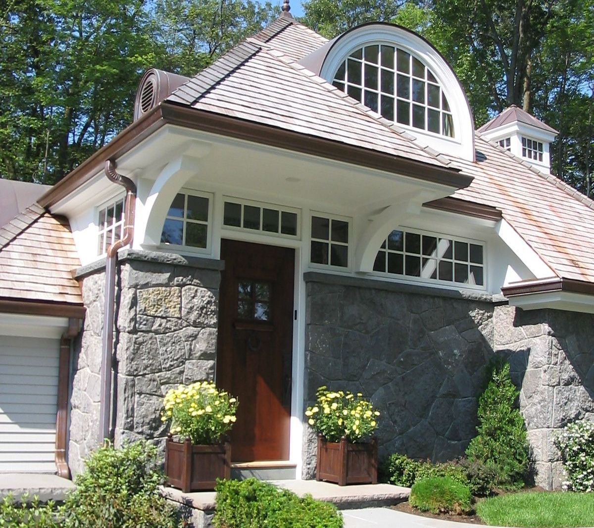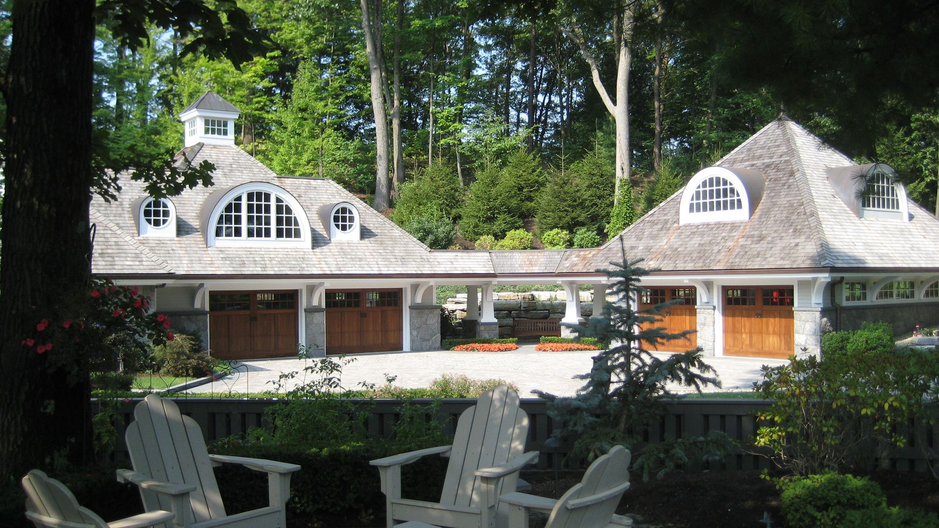 A complex project with garage entrances on two levels and living areas carefully fitted into hip roofs to maximize the volume for living spaces, without creating the appearance of a massive structure. The main building is set into the natural grades at several levels with stone retaining walls. A later addition is expressed as a symmetrical pavilion and connected by a breezeway.